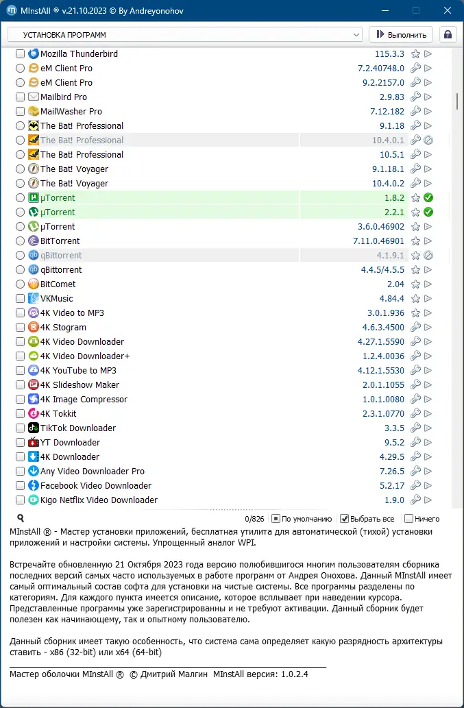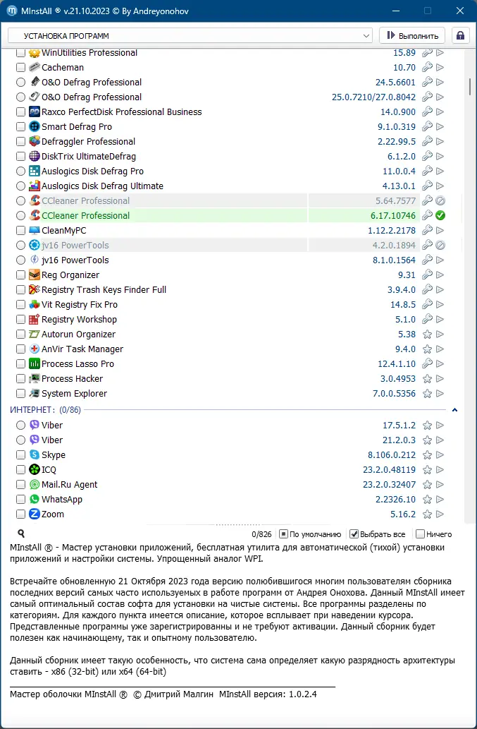 Мощный и универсальный сборник программ, предназначенный для автоматической установки и обновления необходимого софта на различных версиях Windows. Обновленный 21 октября 2023 года, этот сборник собран автором — Андреем Оноховым, включает самые актуальные версии приложений и инструментов, необходимых для эффективной работы, системного администрирования и личных целей.