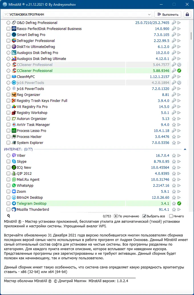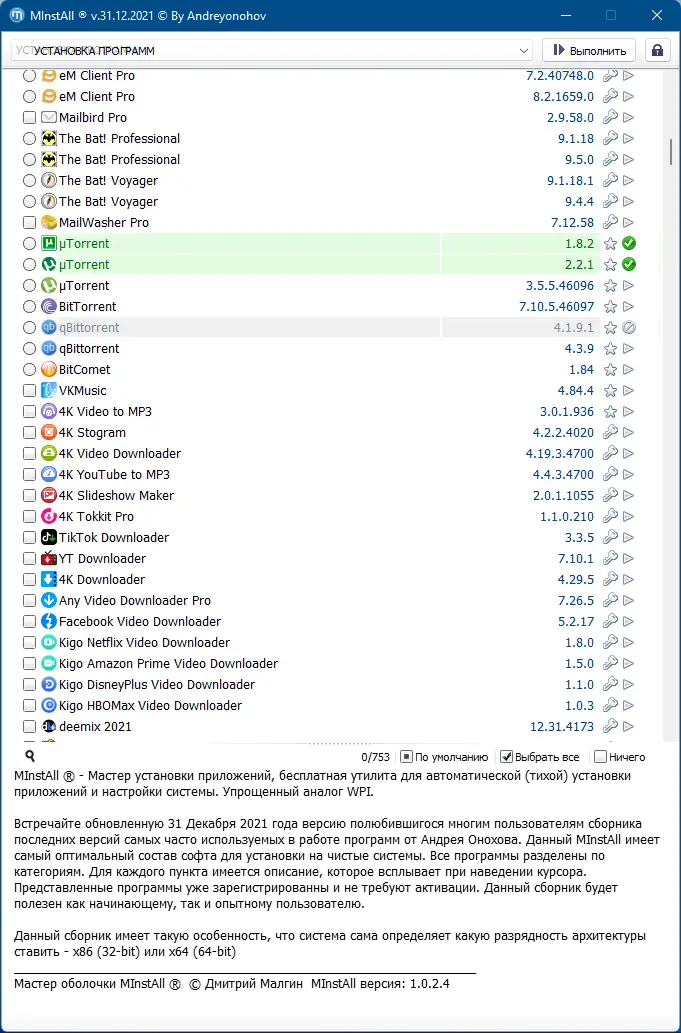 - После загрузки запустите MInstAll и выберите необходимые категории программ или конкретные приложения через меню.