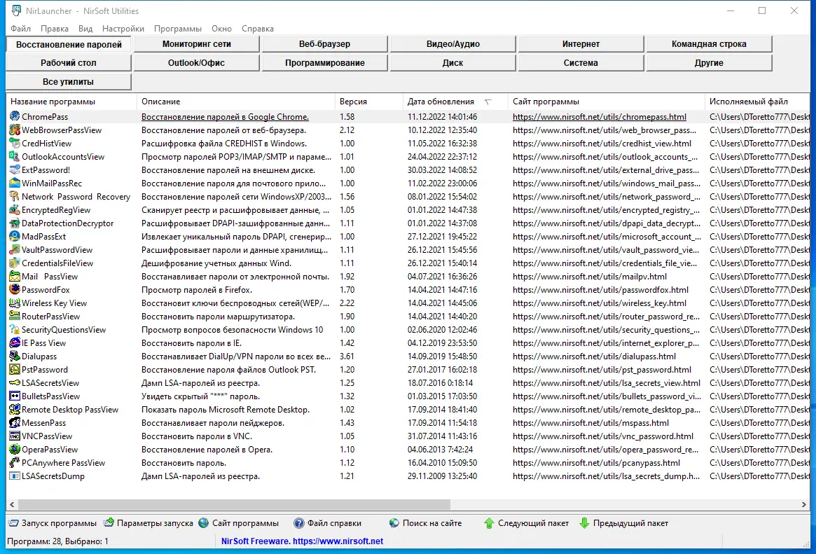 NirLauncher Package — это универсальный пакет из более чем 200 портативных утилит, предназначенных для автоматизации и упрощения ежедневных задач на компьютере. Утилиты включены в состав пакета позволяют редактировать контекстное меню проводника, работать с сетью, восстанавливать пароли почтовых клиентов и браузеров, выполнять дисковые операции, извлекать cookies и кэш браузеров, а также управлять шрифтами. Программа ориентирована на работу в системах Windows 7, 8/8.1, 10 и 11 (x32/x64 Bit), автоматически подбирая нужную версию в зависимости от архитектуры системы.