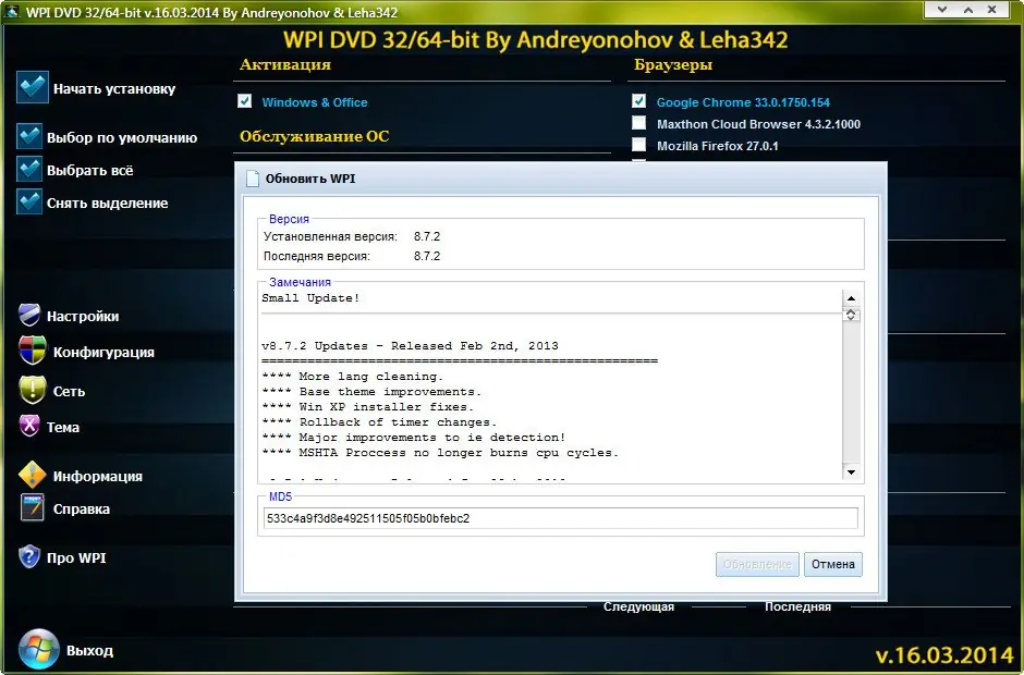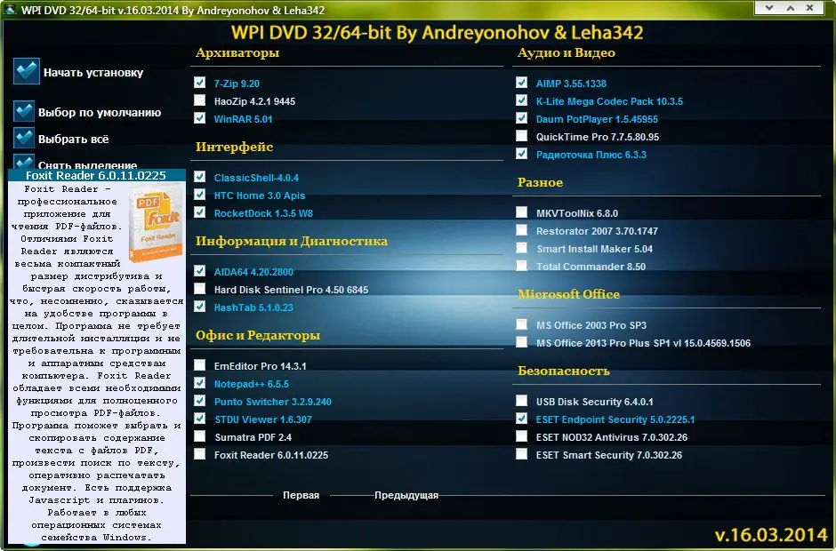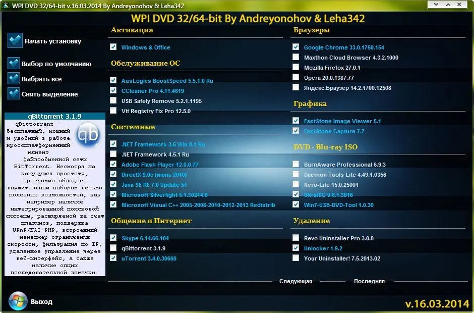 WPI DVD — это обновлённый сборник программ, созданный для быстрого и удобного оснащения чистых систем различных версий Windows. Выпущен 16 марта 2014 года, он включает последние версии популярных утилит по категориям, зарегистрированные и не требующие активации. Уникальная особенность сборника — автоматическое определение разрядности системы (x86 или x64), что значительно упрощает процесс установки для пользователей любого уровня. В основе сборника лежит тщательно подобранный состав программ, учитывающий пожелания пользователей и включающий самые актуальные версии. Этот уникальный комплект идеально подходит как начинающим, так и опытным пользователям, обеспечивая быстрое и лёгкое создание рабочего окружения.