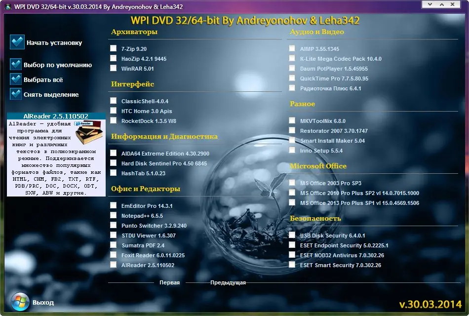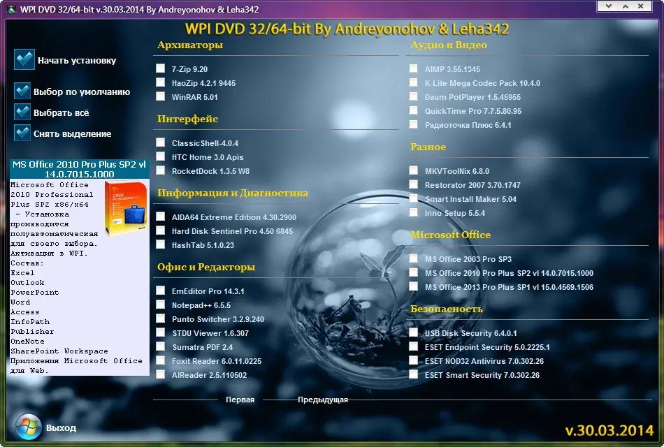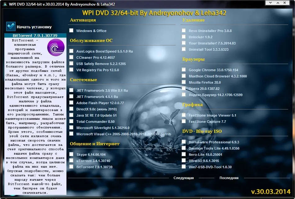 WPI DVD — это обновлённый сборник программ для установки и обслуживания операционных систем Windows 7, 8/8.1, 10 и 11, а также для работы с различными файлами и мультимедиа. Выпущенный 30 марта 2014 года, он содержит последние версии популярных приложений, разделённых по категориям, и автоматически определяет разрядность системы – x86 или x64. Этот интуитивно понятный сборник предназначен как для новичков, так и для опытных пользователей, и помогает быстро подготовить рабочую систему без необходимости отдельной активации зарегистрированного ПО.