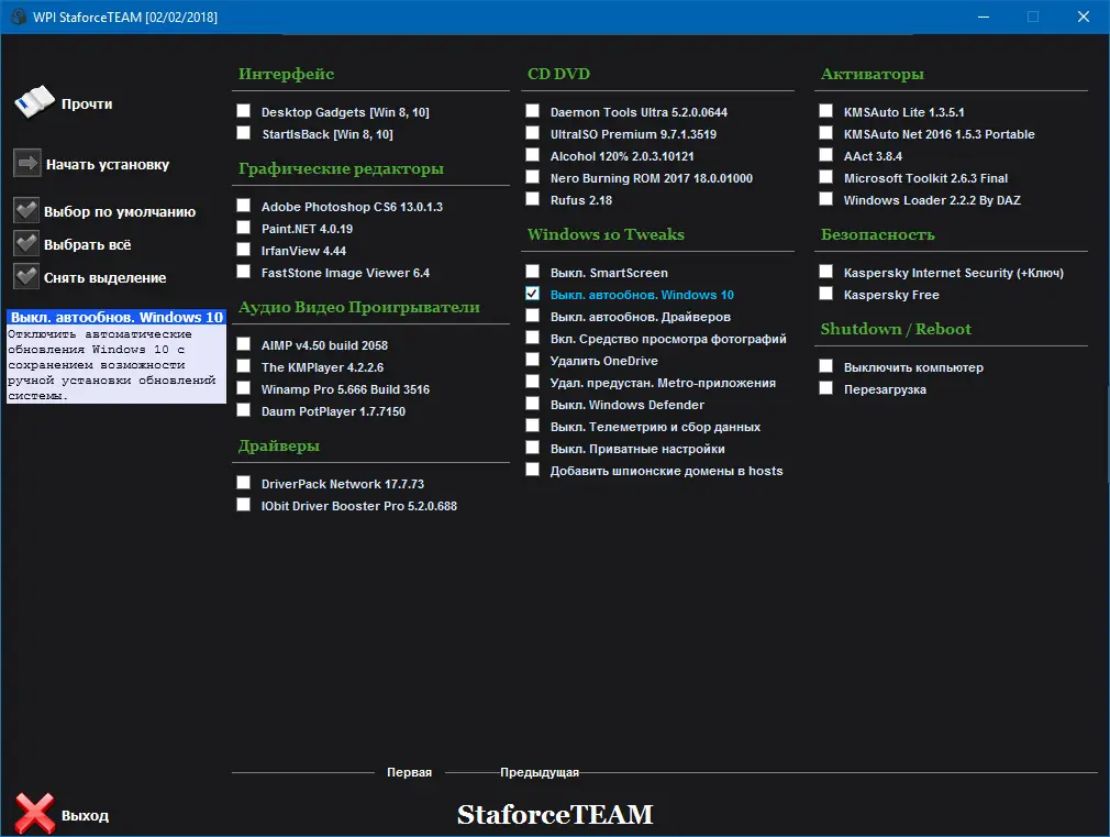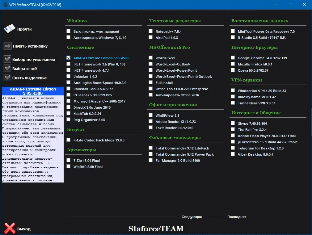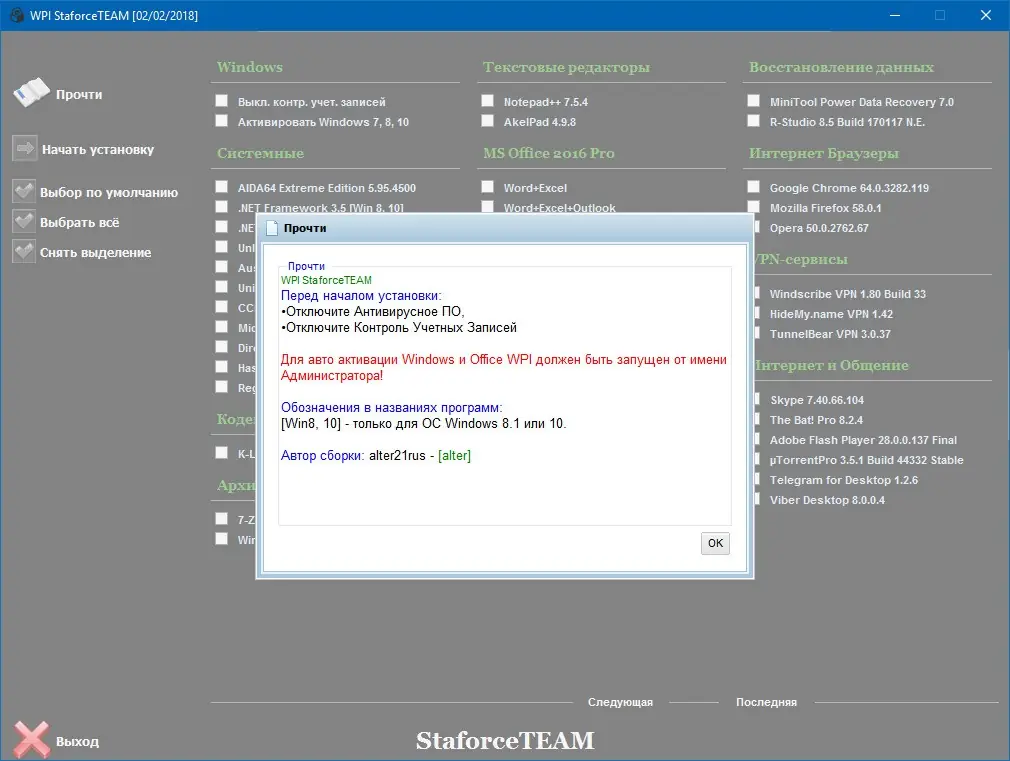 WPI StaforceTEAM — это комплексная сборка программного обеспечения, предназначенная для автоматической установки и настройки различных приложений на операционных системах Windows x86 и x64, включая версии Windows 7, 8/8.1, 10, а также возможна установка для Windows 11. Выпущена 2 февраля 2018 года автором Alter из команды StaforceTEAM. Основная цель сборки — предоставить пользователю полноценный набор инструментов для работы, развлечений и обслуживания системы без необходимости ручной настройки. Перед началом установки рекомендуется отключить антивирусную программу для избежания конфликтов и правильной инсталляции всех компонентов.