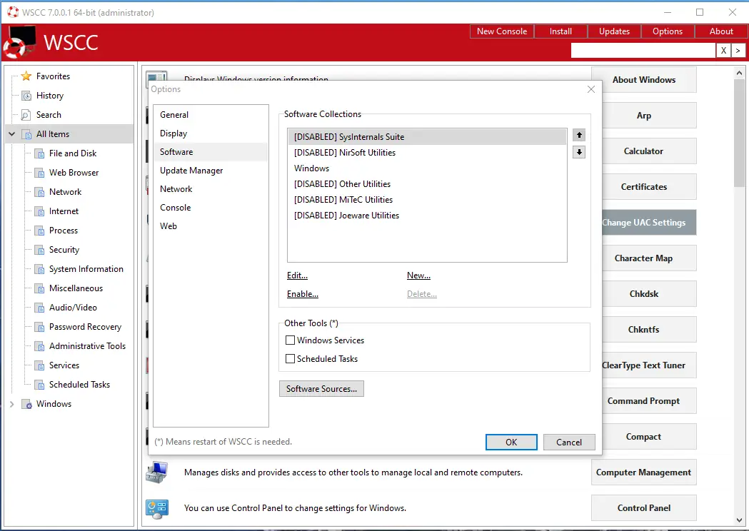 WSCC (Windows System Control Center) — портативная утилита, объединяющая более 300 инструментов, включая пакеты Sysinternals Suite и NirLauncher, предоставляя централизованный доступ к системным средствам без необходимости установки.