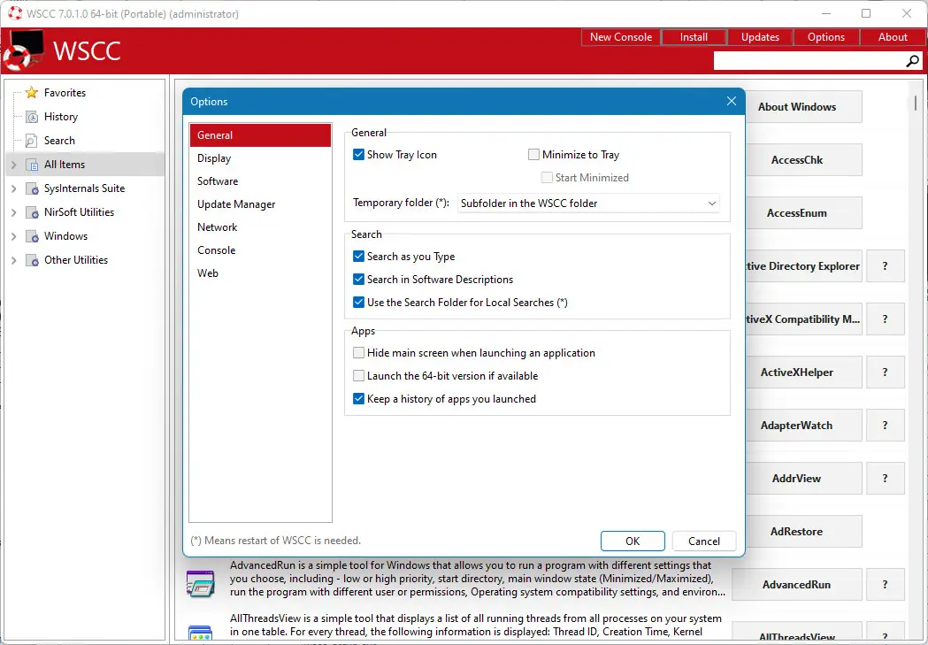 WSCC — это портативная оболочка, объединяющая в себе пакеты Sysinternals Suite и NirLauncher, предназначенная для удобного управления системными утилитами Windows.