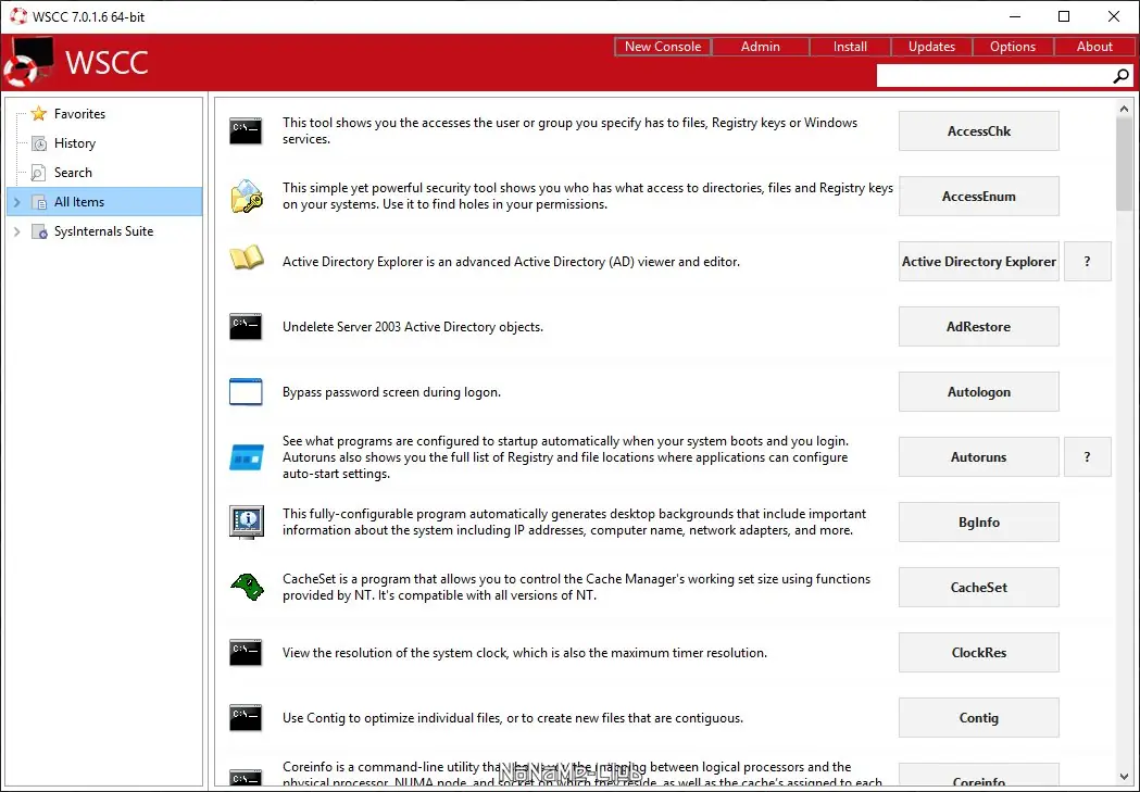 WSCC (Windows System Control Center) — портативная программа, представляющая собой оболочку, объединяющую пакеты Sysinternals Suite и NirLauncher. Все утилиты этого набора разделены по категориям по назначению, что облегчает их поиск и использование. В программу встроена возможность запуска некоторых встроенных средств Windows, а при первом запуске она автоматически ищет существующие инсталляции необходимых пакетов, предлагая скачать их при отсутствии. Предназначена для удобного системного администрирования и диагностики. Всего в пакете содержится около 300 утилит, доступных для быстрого запуска. В системе реализованы такие функции, как Избранное, быстрый поиск и запуск, а также механизм обновления, позволяющий проверять наличие новых версий и скачивать их. Полностью бесплатна для личного использования и совместима с разными версиями Windows.