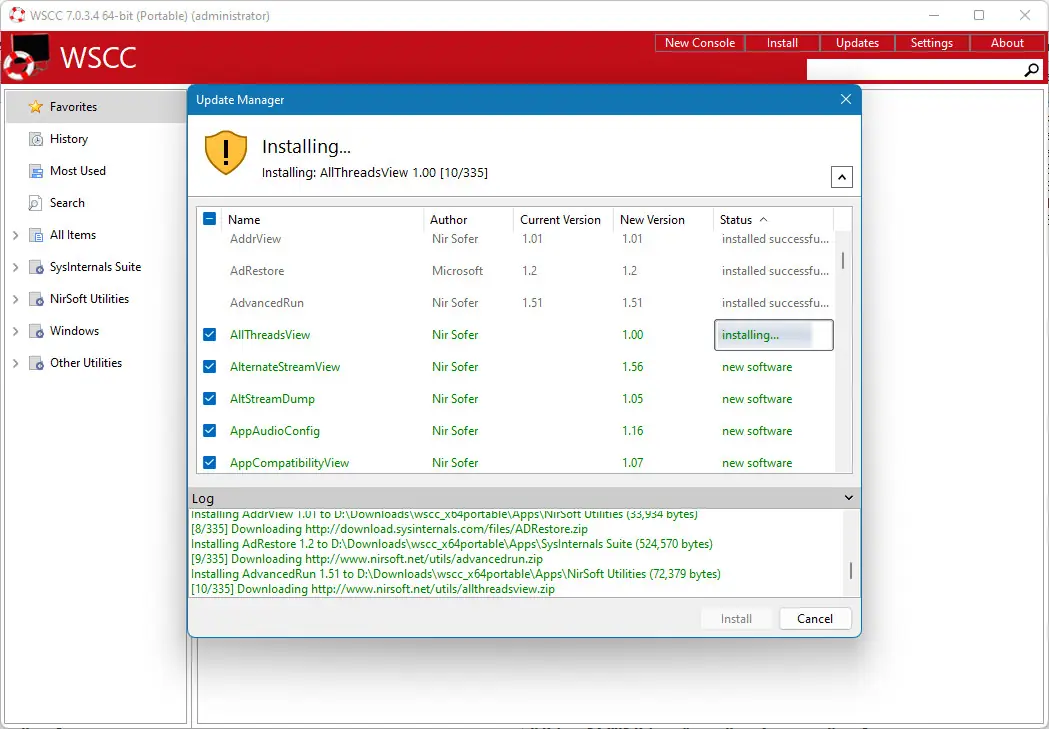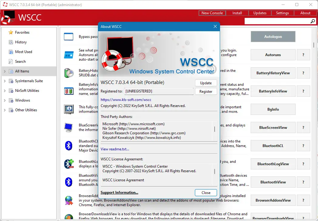 Этот инструмент представляет собой оболочку для работы с более чем 300 утилитами, разделёнными по категориям в зависимости от их назначения. При первом запуске WSCC автоматически ищет существующие инсталляции пакетов Sysinternals и NirLauncher, используя их файлы для оптимизации работы. В случае отсутствия этих оболочек, программа предложит скачать необходимые утилиты с сайтов разработчиков. Помимо этого, реализованы функции быстрого поиска и запуска, вкладка «Избранное» для сохранения часто используемых средств, а также модуль обновления, позволяющий проверять наличие новых релизов и скачивать их. Программа предназначена для работы в портативном формате, что обеспечивает её использование без установки и совместимость с Windows 7, 8/8.1, 10 и 11 как на x32, так и на x64 Bit системах, а также может быть использована бесплатно для личных целей.