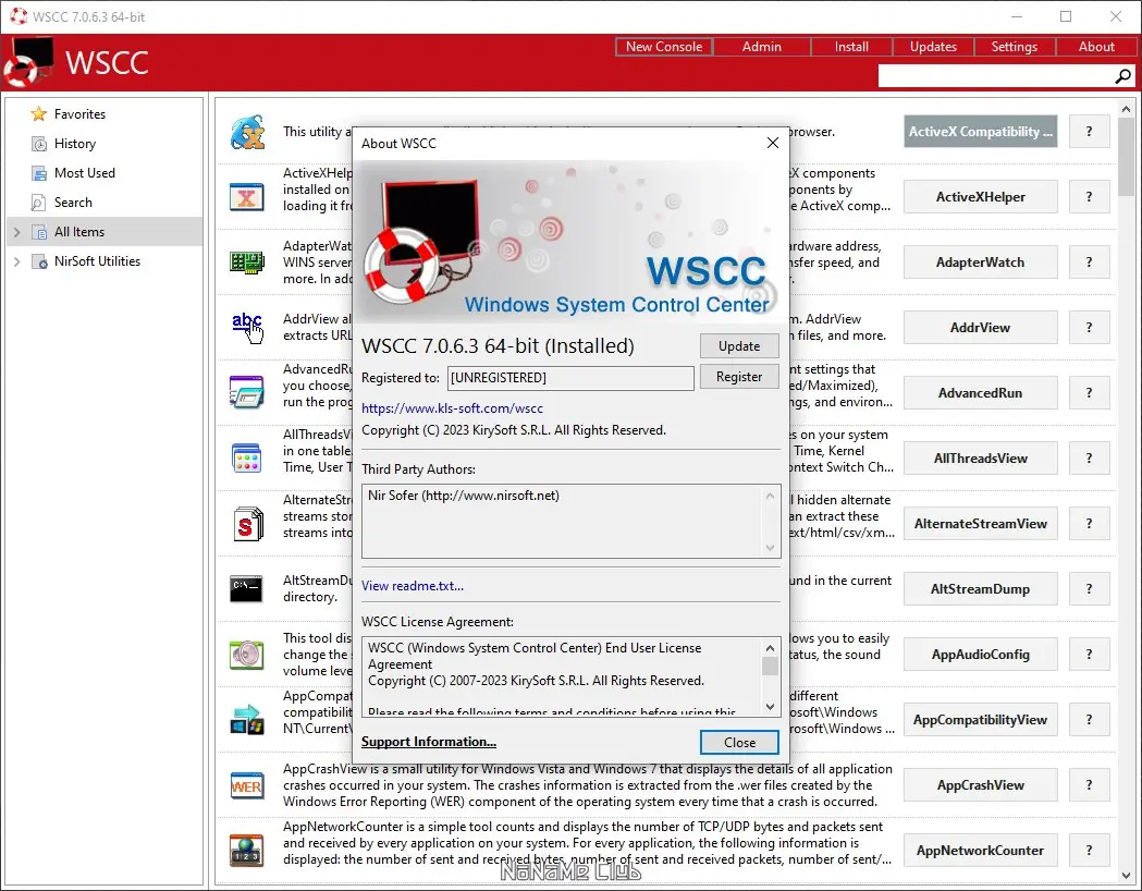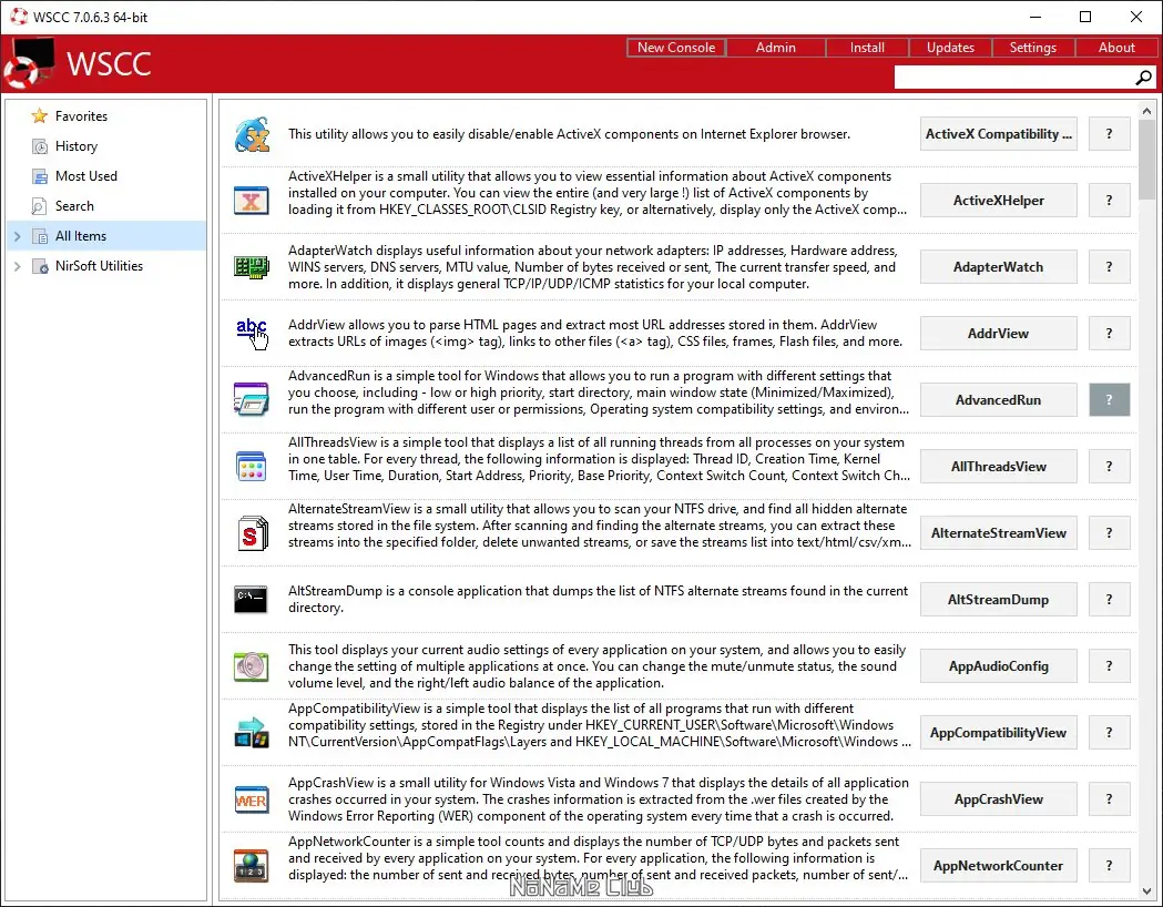 WSCC — это портативная универсальная утилита, объединяющая множество системных инструментов в единую удобную оболочку. Она предназначена для диагностики, обслуживания и мониторинга операционной системы Windows, предоставляя доступ к популярным пакетам Sysinternals Suite и NirLauncher.