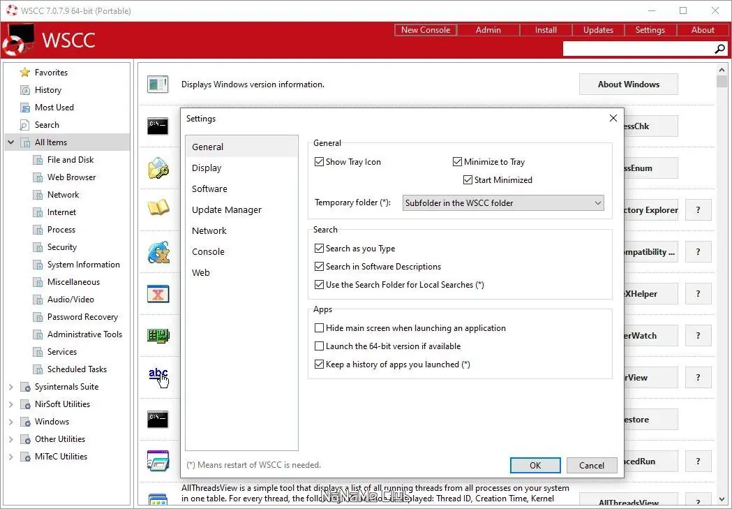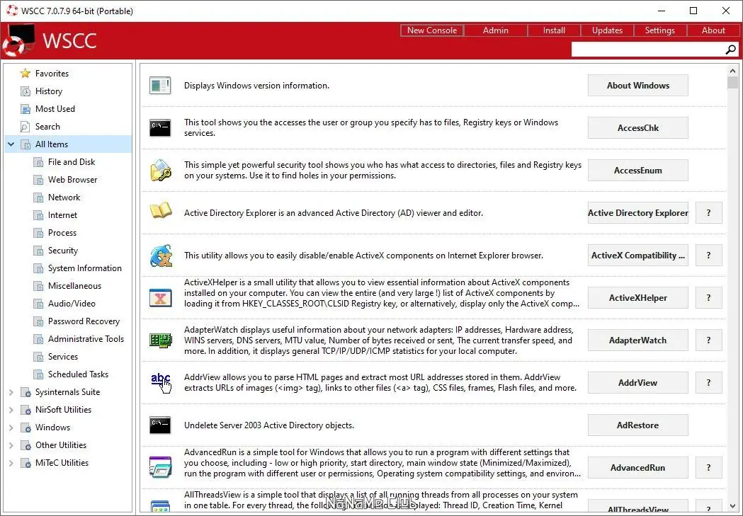 WSCC (Windows System Control Center) — это портативное решение, которое интегрирует в единый интерфейс более 300 полезных утилит для администрирования и диагностики системы. Оболочка самостоятельно ищет установленные версии пакетов Sysinternals и NirLauncher, предлагая их использование или возможность скачать последние версии с официальных сайтов разработчиков. В программу встроены категории по назначению, что облегчает быстрый поиск нужных инструментов. Среди дополнительных возможностей — наличие модуля обновлений, быстрый поиск и запуск, а также режим “Избранное”, в котором можно сохранить часто используемые утилиты.