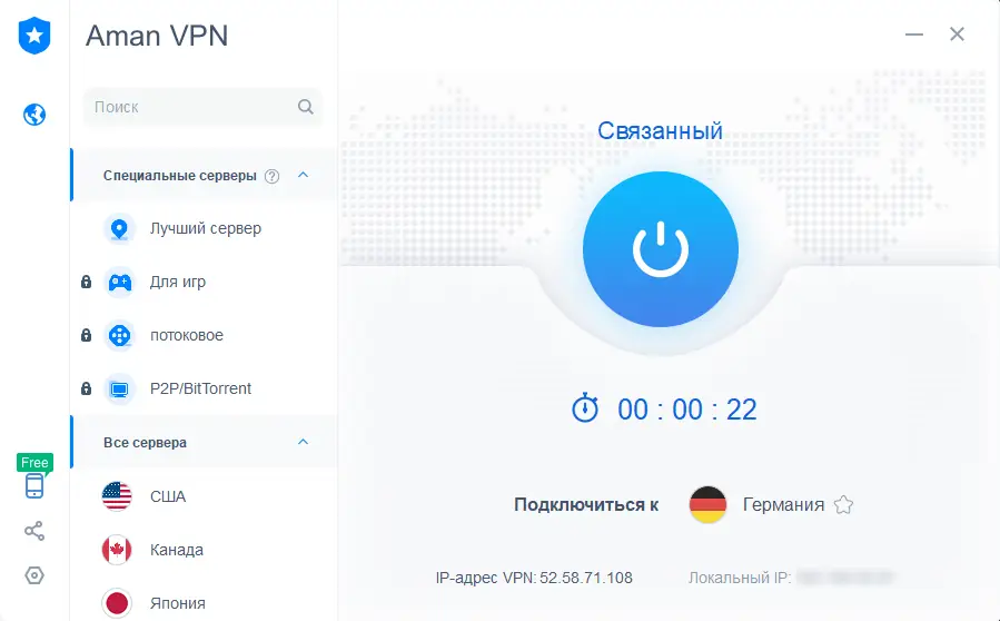 Бесплатная VPN-система AmanVPN обеспечивает быстрый, безопасный и безлимитный доступ к интернету с функциями конфиденциальности и изменением IP-адреса.