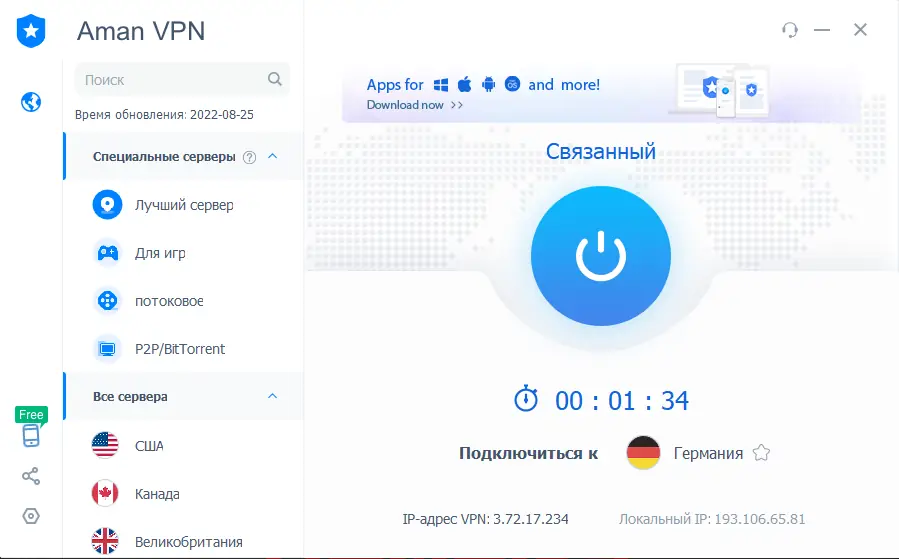 Производительное приложение AmanVPN — это качественное программное решение, предназначенное как для обхода блокировок, так и для усиления защиты вашего ПК. Оно предоставляет бесплатный доступ к частным VPN-серверам и обеспечивает стабильное интернет-соединение для комфортного серфинга по ресурсам, которые могут быть заблокированы вашим провайдером. Помимо обхода ограничений, VPN-программа применяется в общедоступных сетях Wi-Fi для полного шифрования трафика и предотвращения утечек данных. Надёжное шифрование защищает ваши личные сведения и обеспечивает бесперебойный доступ к любимым сайтам, социальным сетям и торрент-трекерам, а также способствует повышению конфиденциальности за счет смены IP-адреса. Программа совместима с системами Windows, Linux, а также для мобильных устройств на Android и iOS, что делает её универсальным решением для разных платформ.