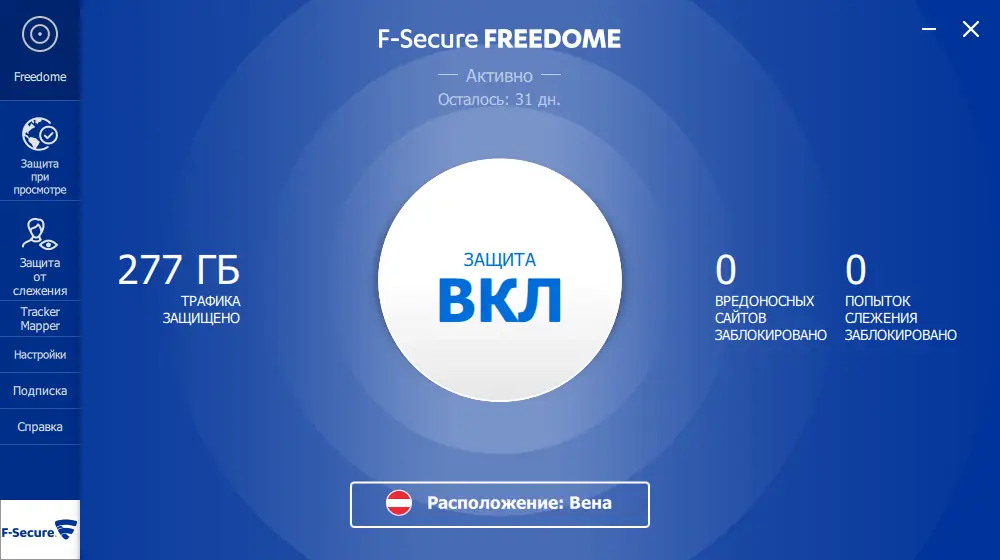 F-Secure Freedome VPN — надежное и эффективное решение для защиты вашей приватности в сети. Он использует несколько удаленных серверов по всему миру для перенаправления интернет-трафика, обеспечивая скрытие вашего реального IP-адреса и возможность выбрать виртуальное местоположение из многочисленных стран. Приложение создает зашифрованное соединение, что делает невозможным отслеживание ваших действий, а также блокирует вредоносные и мошеннические сайты. Удобный интерфейс и простота управления позволяют быстро настроить необходимую защиту всего в один-два клика. Обратите внимание, что на территории России доступ к серверам F-Secure Freedome VPN блокируется, для обхода блокировок потребуется использовать другой VPN-сервис на время сброса триального периода.