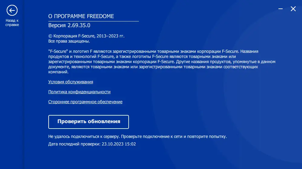 Обратите внимание, что в связи с политикой F-Secure для российских IP-адресов получение новых 5-дневных пробных периодов теперь невозможно, а доступ к серверам VPN ограничен на территории России. Для продолжения использования потребуется подключение через другой VPN-сервис на время сброса триала.