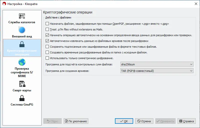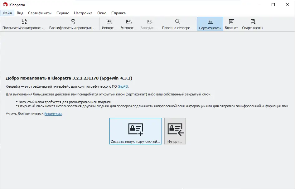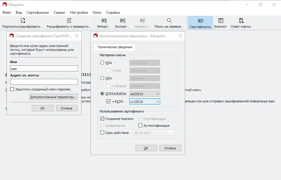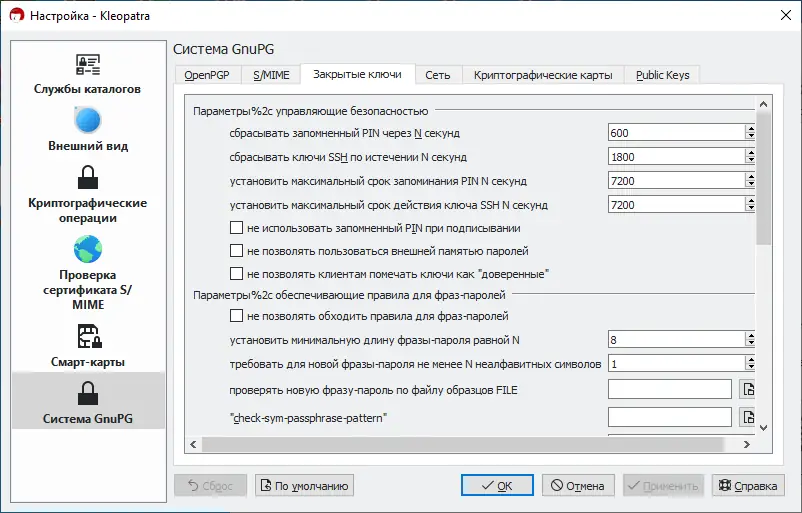 - Поддержка работы с ключами длиной от 1024 до 4096 бит, а также управление сертификатами и ключами через встроенный менеджер kleopatra.