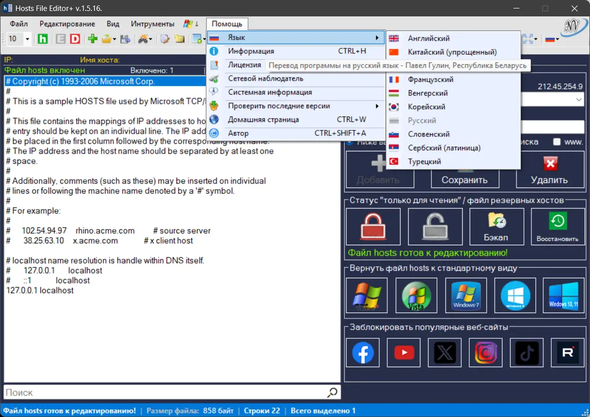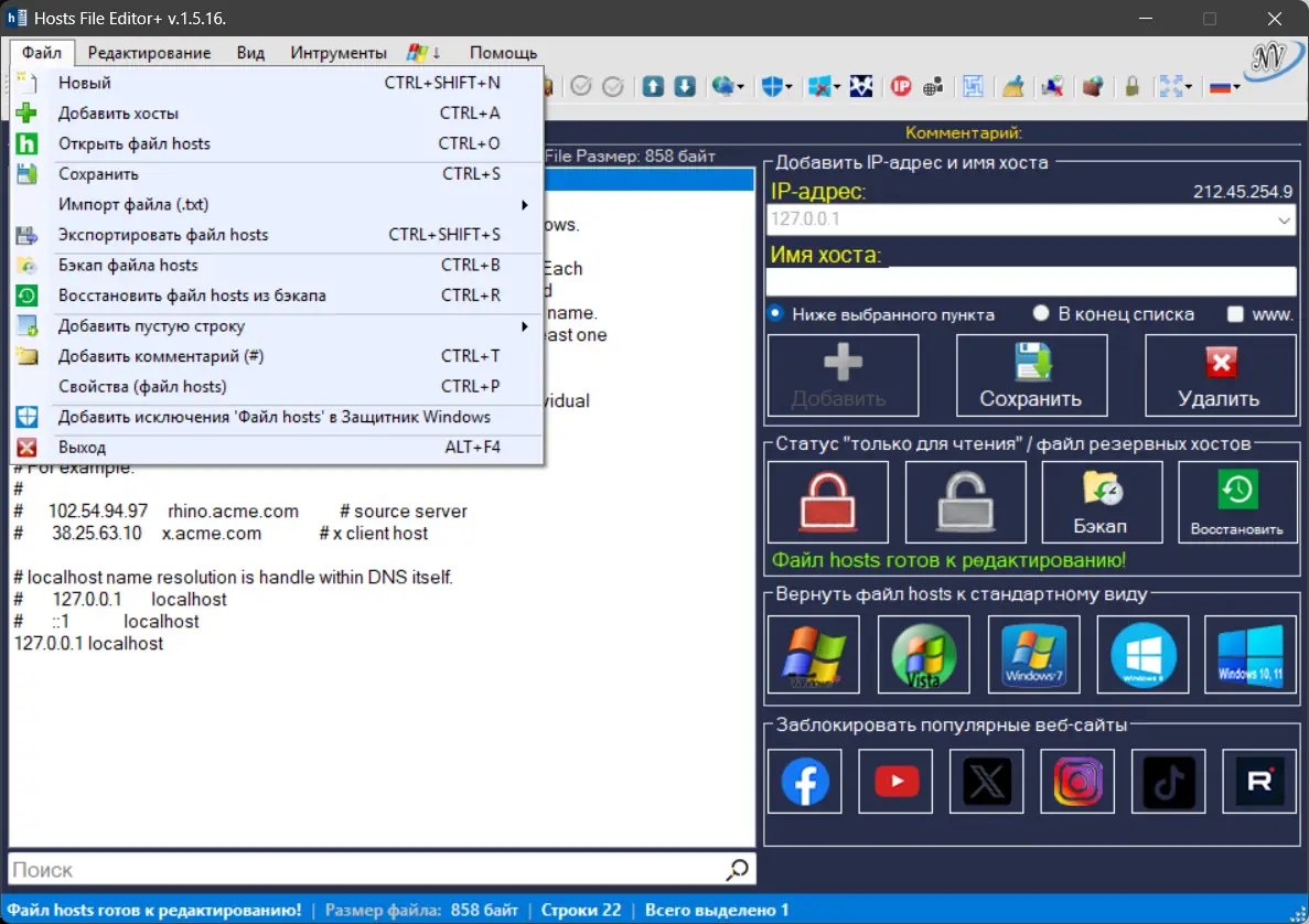 - Интуитивный интерфейс и понятные инструменты редактирования host файлов