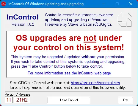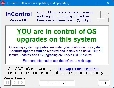 InControl — это бесплатная небольшая портативная утилита, которая позволяет управлять обновлениями Windows 10 и Windows 11, предотвращая автоматическую установку новых версий и сохраняя выбранную вами конфигурацию системы.