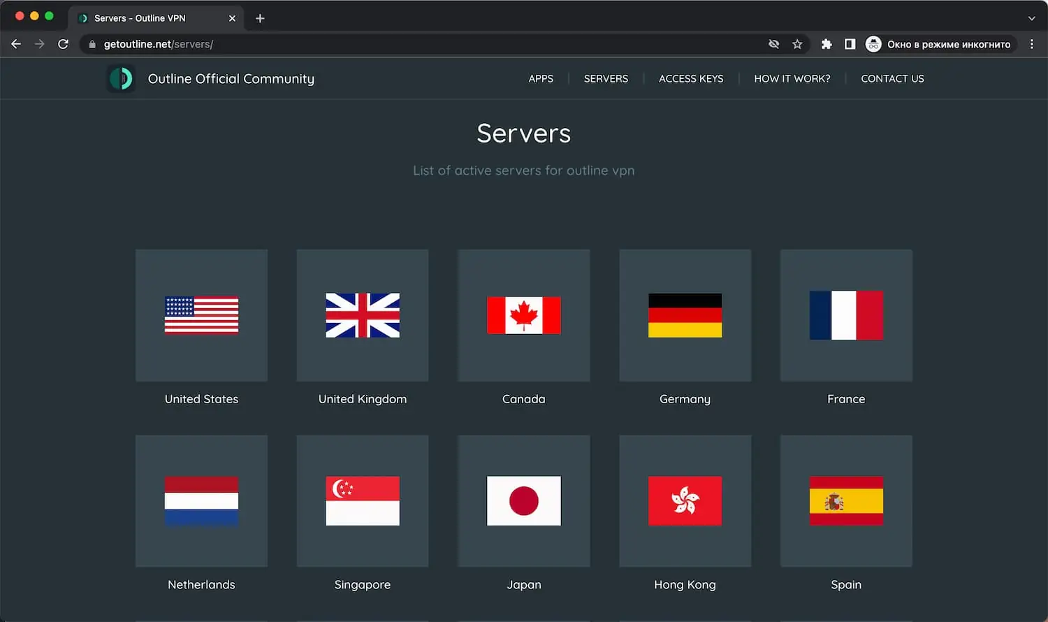 - Перейдите на страницу сообществом Outline – Servers и выберите страну сервера, который хотите использовать.